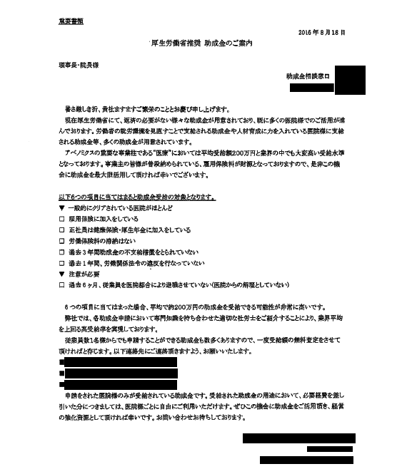 「厚生労働省推奨 助成金のご案内」という件名の案内文書が届いたとの情報が北海道内の複数の医療機関よりありました。